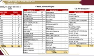 Por: Escena Chiapas/ Tuxtla Gutiérrez, Chiapas La Secretaría de Salud del estado anunció que en las últimas 24 horas en Chiapas se presentaron 123 casos nuevos de COVID-19 en 34 municipios, de acuerdo al panorama epidemiológico. Los casos se registraron en Tuxtla Gutiérrez (25), Tapachula (22), Villaflores (10), Cacahoatán…